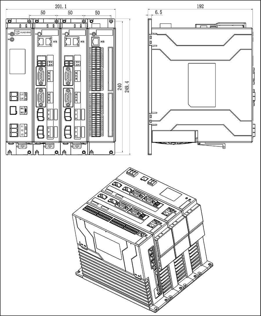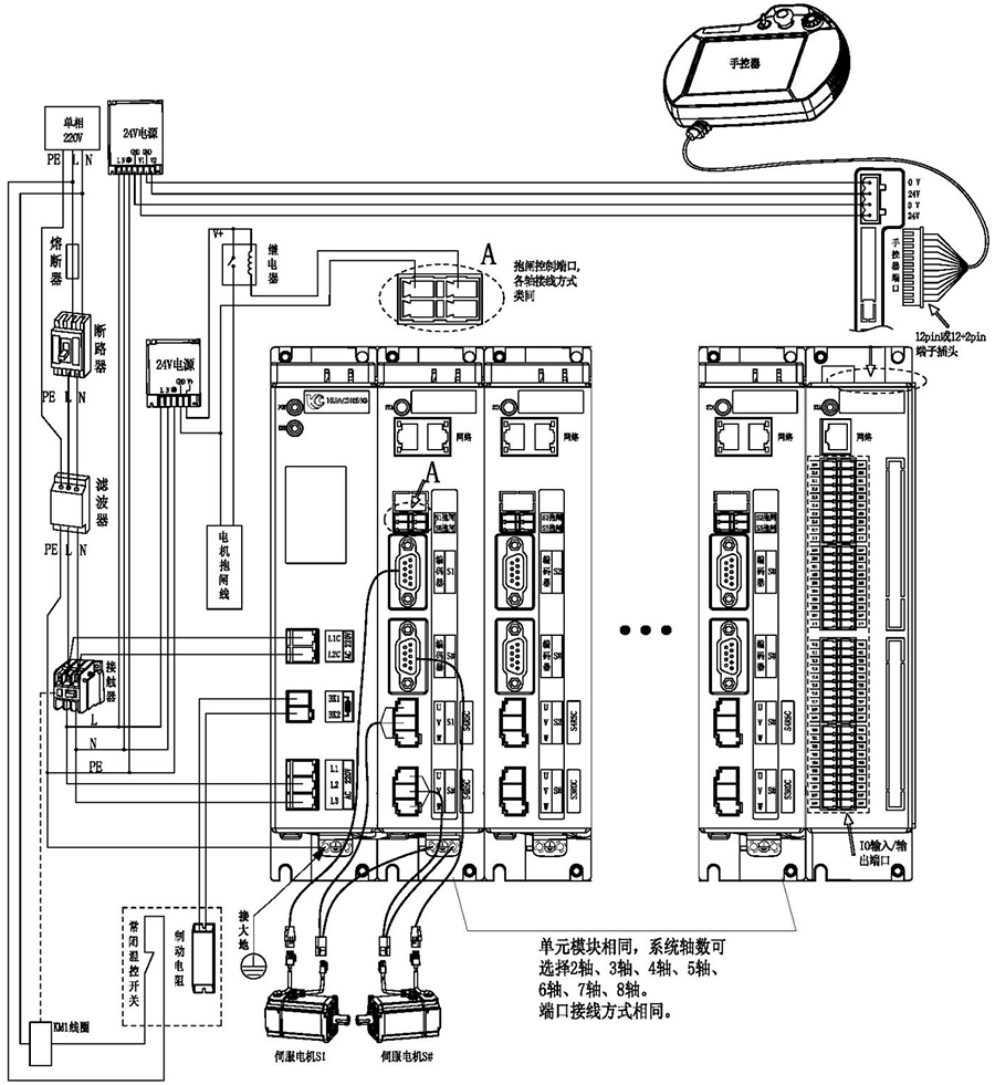 3)省略號處單元模塊相同,系統軸數可選擇2軸、3軸、4軸、5軸、6軸、7軸、8軸。端口連接方式相同。