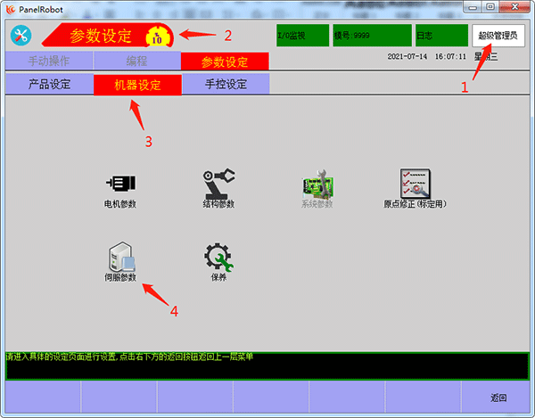 將三檔開關撥到“手動”界面,使用關節坐標模式將報警軸原點位置對應好;再次切換為“參數設定”界面,選擇“電機參數”點擊“設為原點按鈕”重新記錄報警軸原點位置。