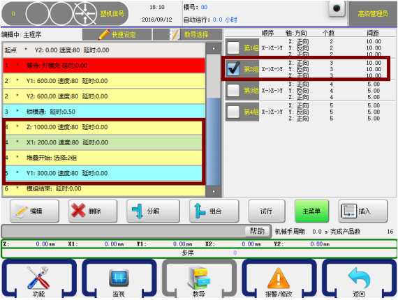 選中要插入的堆疊程序組左邊的方框,如選擇第2組堆疊程序,再點擊【插 入】按鈕將該組堆疊程序插入到要開始堆疊的程序步前,自動運行時,機械手即按照此堆疊程序堆疊排放產品。如果要使用Y軸進行堆疊時,務必將堆疊程序插入到Y軸下降動作的前一步。