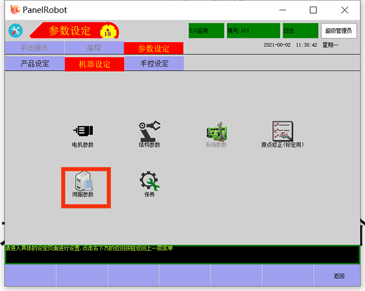 1、先進(jìn)行權(quán)限登錄,然后把手控器的狀態(tài)切換為停止?fàn)顟B(tài),然后找到參數(shù)設(shè)定中的機(jī)器設(shè)定中的伺服參數(shù);