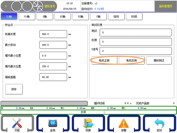 ① 按下【電機正轉】,軸應該向遠離原點的方向走。【測試】數值 10000,【反饋】數值 10000