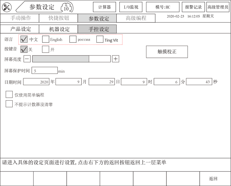 華成工控全系列機械手手控器(示教器)語言版本切換,如中文改英文,英文改中文,特殊的還有越南文、俄文、韓文等。各系列機械手手控器(示教器)切換語言版本的操作如下: