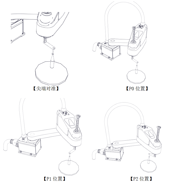 3)移動機械手到標(biāo)定點正上方,機械手的尖端要與標(biāo)定工具的尖端對準(zhǔn),設(shè)入P0;轉(zhuǎn)到U軸獲取新的角度,移動機械手使其尖端對準(zhǔn)標(biāo)定工具的尖端,設(shè)入P1(P1的U軸角度要與P0的U軸角度相差90~120度);再次轉(zhuǎn)到U軸獲取新的角度,移動機械手使其尖端對準(zhǔn)標(biāo)定工具的尖端,設(shè)入P2(P2的U軸角度要與P0/P1的U軸角度相差90~120度)。示意圖如下: