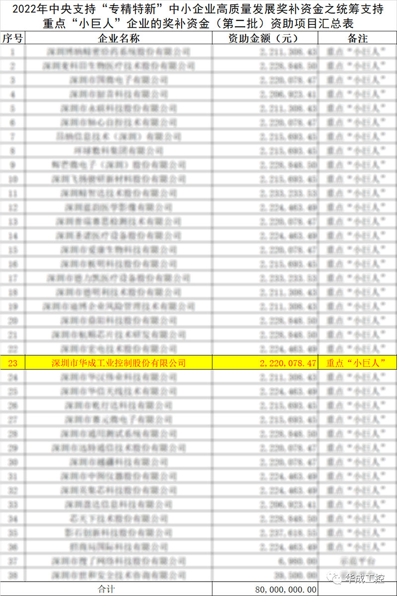 近日,2022年中央支持“專精特新”中小企業(yè)高質(zhì)量發(fā)展獎補資金之統(tǒng)籌支持重點“小巨人”企業(yè)的獎補資金(第二批)資助項目已公示,深圳市華成工業(yè)控制股份有限公司榮獲國家級重點“小巨人”資助金222萬元!