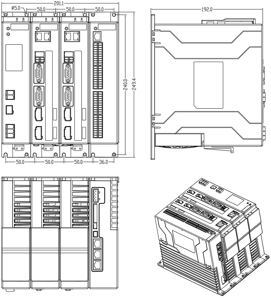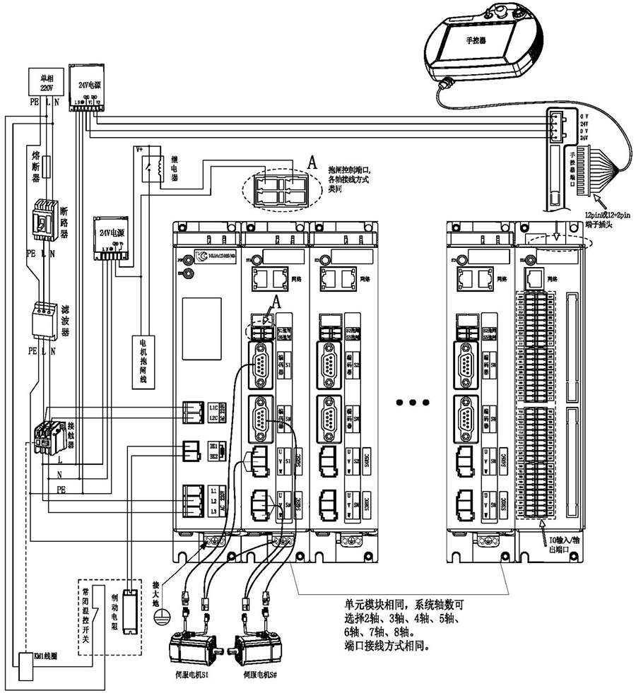3)省略號處單元模塊相同,系統(tǒng)軸數(shù)可選擇2軸、3軸、4軸、5軸、6軸、7軸、8軸。端口連接方式相同。
